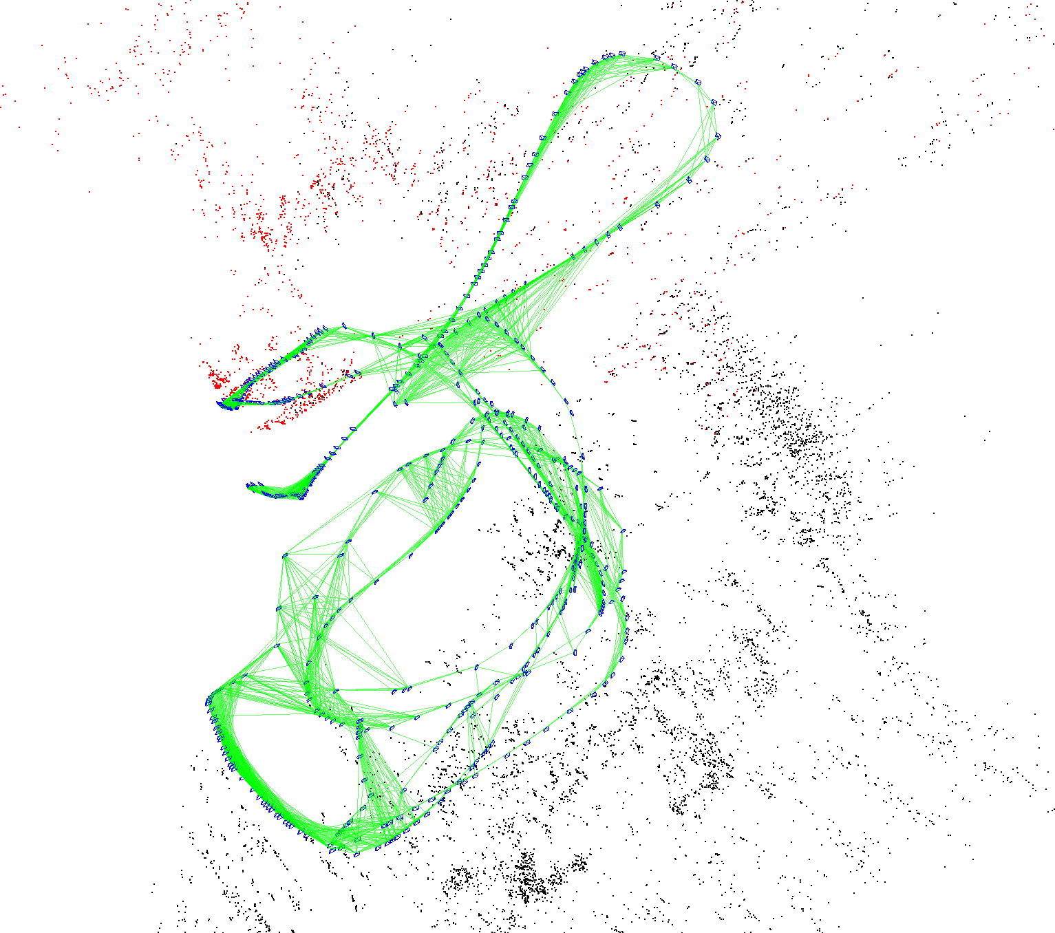 先来张图,下图就是利用相机作为传感器在环境中采集一系列的图像,经过SLAM系统建立的点云图以及相机轨迹。